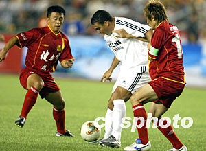 西班牙皇家馬德里足球隊與中國健力寶龍隊的比賽八月二日晚在北京工人體育場舉行。圖為羅納爾多被中國龍隊隊員前后夾擊防守。中新社記者:毛建軍