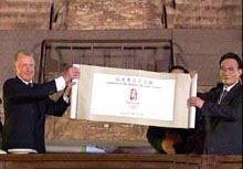 載著奧運會會徽的車輛從中華世紀壇出發,經過長安街,經過半小時的運送經達天壇,由鄧亞萍和成龍護送進入現場。