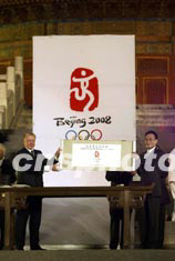 中共中央政治局常委、全國人大常委會委員長吳邦國和國際奧委會協(xié)調(diào)委員會主席維爾布魯根將這方以“中國印·舞動(dòng)的北京”命名的會徽徽寶,飽蘸紅色印泥,在中國宣紙上鄭重蓋下了印記。從這一刻起,舞動(dòng)的北京張開雙臂,以開放的姿態(tài)迎接四方友人,與世界共同起舞。