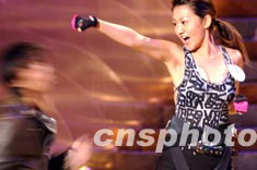 日前,在香港舉行的2003年度香港小姐競選準決賽上,進入十二名佳麗行列的王從希,在準決賽現場表演精彩的“少女武功”。中新社記者:錢興強