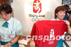 八月四日是2008北京奧運會徽揭曉后的第一天,會徽紀念產品開始在北京定點商場限量發售。北京百貨大樓的營業員正在向顧客展示紀念T恤衫,最便宜的T恤衫每件賣108元人民幣。中新社記者:張煒
