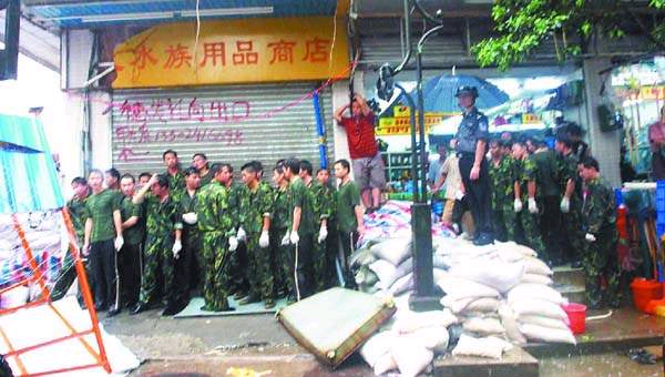 據武副場長介紹,8月5日下午3時15分左右,黃沙市場有關人員得知此事后,派出保安將紅線界上的店鋪移走。昨天上午8時左右,市水產供銷公司一方60多名身穿迷彩服的男子手持木棍、鋼管等物來到黃沙市場內。市場內的保安得知后就迅速向上級報告,并及時向荔灣區多寶路派出所報警。當派出所警察趕至現場時,勸說對方放下木棒及鋼管時,遭到對方拒絕。警察又迅速向110求援,隨后就有10多名防暴警察趕至現場,用盾牌將雙方人員隔開。