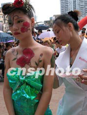 七日,在廣州上下九商業步行街廣場上,一場精彩的人體彩繪吸引眾多市民駐足觀看。在廣州,人體彩繪已成為商業推廣中的一項主要活動。作者:劉衛勇