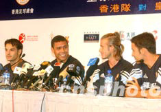 香港足球總會八月七日在香港舉行記者會,皇家馬德里足球隊球星魯爾、朗拿度、碧咸、摩連迪斯出席記者會。 中新社記者:錢興強