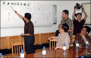 在后方指揮部的一間小會議室里,閃光燈在不停地閃爍,領導、煤礦負責人、記者,擠了滿滿的一屋人。晚上22點25分,山西省省委書記田成平從太原趕到陽泉,長形會議桌前,煤礦負責人正在掛在墻上的“裕公井K7210面大樣圖”前介紹煤礦和事故的基本情況。