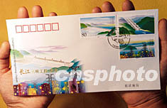 中國國家郵政局定于2003年8月20日發行《長江三峽工程·發電》特種郵票1套3枚,三枚郵票的名稱分別為:水庫蓄水、船閘通航、電站發電。為配合這套郵票的發行,北京市郵票公司特設計印制了此套郵票的首日封(圖),與郵票同日發行。中新社記者:鄒憲