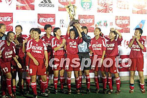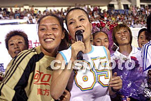 2003中國女足南北明星爭霸賽八月十七日晚在北京先農壇體育場進行,經過八十分鐘的全場較量,最終北方隊憑借韓端的帽子戲法最終以4:1戰勝南方隊獲得本屆中國女足南北明星爭霸賽的冠軍。中新社記者:盛佳鵬