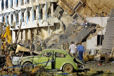 聯(lián)合國雇員告訴福克斯新聞,爆炸發(fā)生時大樓里至少還有150名工作人員。福克斯新聞記者丹-斯普林杰自現(xiàn)場發(fā)回的報道稱,兩層高的“運(yùn)河賓館”有整整一個角被炸掉!據(jù)稱,爆炸的中心位置好象位于賓館的大廳。(章田)