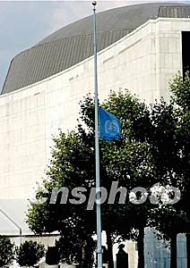 聯合國駐巴格達總部大樓十九日遭炸彈襲擊,二十人在爆炸中喪生,紐約聯合國總部隨即降半旗致哀。中新社記者:趙海燕