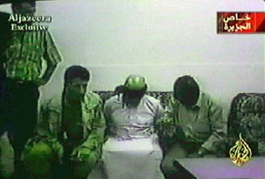 中新網8月21日電 “半島”電視臺新聞節目抓圖。畫面上為8月20日一名庫爾德戰士看守著薩達姆的得力助手--伊拉克副總統塔哈·亞辛·拉馬丹。庫爾德人于8月19日在摩蘇爾市的突襲行動中抓獲了拉馬丹。拉馬丹在美軍55人撲克牌通緝令中名列第20位。至此,通緝名單上已有38人被捕或被擊斃。(春風)