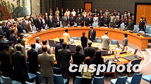 聯合國安理會二十日晚間舉行緊急會議研究有關聯合國設施的安全保障問題,與會的安理會成員國代表在會議中起立默哀,悼念十九日發生在巴格達的炸彈襲擊事件中的遇難者。中新社記者:趙海燕