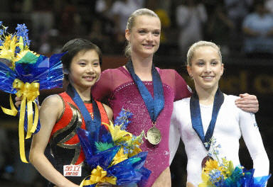 在北京時(shí)間23日上午10點(diǎn)50分結(jié)束的世界體操錦標(biāo)賽女子個(gè)人全能比賽中,中國(guó)小將張楠(左)以四個(gè)單項(xiàng)37.624分的總分獲得了一枚銅牌。俄羅斯著名選手霍爾金娜(中)蟬聯(lián)了金牌,美國(guó)運(yùn)動(dòng)員佩特森(右)奪得銀牌。