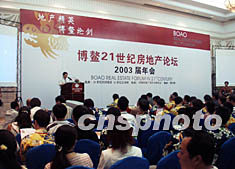 博鰲二十一世紀房地產論壇二00三屆年會二十三日在海南博鰲隆重開幕,來自全國各地的房地產公司老總出席,論壇主題為“金融緊縮下的中國房地產。作者:莫成雄