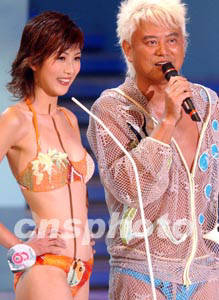 香港明星郭富城和日本世界著名小提琴家西崎崇子,在二十三日晚紅(石+勘)香港體育館舉行的2003年度香港小姐競選決賽上擔任評判。 中新社傳真 錢興強 攝