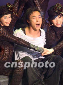 香港歌星陳弈迅,在二十三日晚(石+勘)香港體育館舉行的2003年度香港小姐競選決賽上演唱 。中新社記者:錢興強