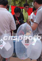 八月二十四日,北京一家避孕用品經銷商在繁華的西單街頭向行人免費派送安全套,許多市民大膽接受,忸怩之態并不多見。中新社記者:張煒