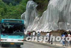 馳名中外的四川省九寨溝風景旅游地今夏正在拓寬綠色環保觀光車的道路,路邊工作面被蒙上專用材料,一邊遮擋泥石,一邊培育綠草。修路宛如保護環境的行為藝術。中新社記者:賈國榮