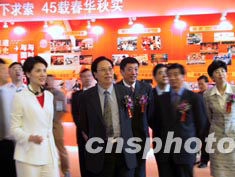 中央電視臺建臺四十五周年發(fā)展成就展八月二十九日在北京軍事博物館開幕。圖為中國廣播電影電視總局局長徐光春和嘉賓參觀展覽。中新社記者:杜洋
