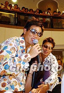 香港歌星蘇永康、許志安,8月31日在海港城為“香港安康演唱會”宣傳時,與現場歌迷高歌一曲,玩得開心。作者:洪少葵