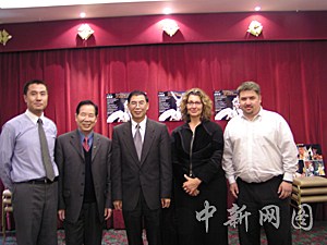 中國京劇《白蛇傳》首次參加澳大利亞多元文化藝術節,將于9月25日至28日在悉尼連演4天,并于29日在堪培拉演出1天。中國京劇院將派出46位藝術家來澳演出。圖為中國駐悉尼總領事廖志洪(中),劉大衛(左1),著名僑領周光明(左2),藝術節董事會主席瑪賽羅斯(女)和藝術總監曼尼迪斯在新聞發布會上合影。中新社記者 劉雨生 攝