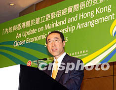 香港財政司司長唐英年五日出席由香港貿易發展局舉辦的“內地與香港關于建立更緊密經貿關系安排”最新進展交流會。圖為唐英年致開幕辭。中新社圖