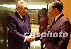 美國前國務(wù)卿基辛格(左)八日來到紐約的中國常駐聯(lián)合國代表團(tuán)駐地,參加王光亞(右)舉行的就職招待會(huì),并向王光亞出任中國常駐聯(lián)合國代表表示祝賀。作者:龔文謨