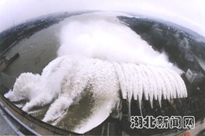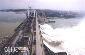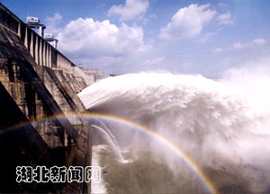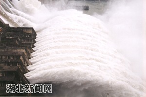 中新湖北網9月9日電 漢江第二次洪峰于八日凌晨一點到達丹江口水庫,最大洪峰流量達二萬八千五百立方米每秒,大約在今天下午五點丹江口水庫水位將達到一百五十六點七米,為一九八四年來最高水位。為緩解對水庫壓力,丹江口水庫開閘向下游泄洪。劉鐵軍 攝