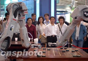 為期四天的第六屆中國北京國際科技產業博覽會十二日在北京拉開序幕,首鋼集團展出的機器人象棋表演賽吸引觀眾。中新社記者:張宇