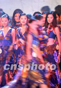 九月十三日晚,在2003年新絲路中國模特大賽海南三亞天涯海角的演出排練現場,身著絢麗晚裝出場的模特成為舞臺上流動的風景。中新社記者:盛佳鵬