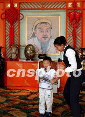 吉林省松原市郊的查干湖畔如今新建了許多觀光蒙古包,年幼的蒙古族男孩在中國元代英雄成吉思汗的肖像前持刀照相。成吉思汗的蒙古鐵騎大軍曾經馳騁歐亞大陸而名垂青史。中新社記者:賈國榮