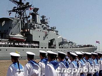 9月20日,俄羅斯海軍“潘捷列耶夫海軍上將”號大型反潛艦,在太平洋艦隊副司令科涅夫·亞歷山大·瓦西里耶維奇中將率領下抵達青島港。圖為歡迎俄艦來訪的中國海軍官兵。鄒山 攝
