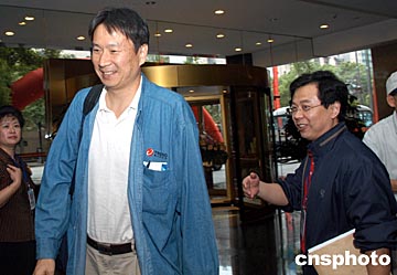 北京新浪聯席董事長姜豐年九月二十一日中午抵達長沙,準備出席二十二日開幕的“第二屆世界華文傳媒論壇”,圖為中國新聞網孫永良(右)與新浪聯席董事長姜豐年。中新社記者:張宇