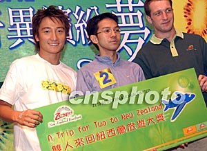 香港歌手方力申,九月二十三日在香港舉行的“ZESPRI奇異黃金夢慶祝會”上主持問答游戲。圖為一名參賽者獲得雙人往返紐西蘭旅游大獎。中新社記者:錢興強(qiáng)