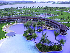 事實上,當記者站在酒店總統套房的大露臺上,心曠神怡的感覺真是撲面而來。在這個露臺上俯瞰酒店的生態泳池,綠色的島嶼小品與棕色木質燒烤回廊講述著回歸自然的故事;視野穿過起伏的高爾夫球場,可以遠眺南中國海的碧波。一條被河流沖積泥沙與外海海浪共同作用而成的沙堤——玉帶灘,蜿蜒三公里將萬泉河、龍滾河、九曲江三江入海口分成了內外咸淡兩海,其中內海之中形成若干個小島,在眼前演繹著豐富而多變的江、河、湖、海、島嶼、山脈的水域景觀。