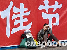中國大陸在今春抗擊“非典”過后又恢復(fù)節(jié)日長(zhǎng)假。圖為北京一名辛勞的女士在采購大批節(jié)日商品后,坐于擁擠的市場(chǎng)外小歇。中新社記者:鄒憲