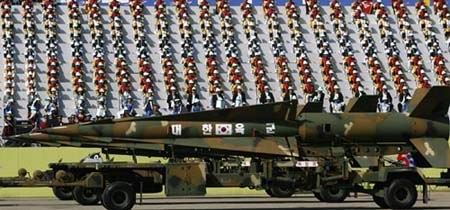 這次閱兵式展出了大型高科技武器,其中包括法制便攜式導彈、韓國國產(chǎn)巡航導彈、防區(qū)外發(fā)射的AGM-142空對地導彈。由以色列設計的這種被稱作“瞪眼”的導彈是韓國加強軍力計劃的一部分,這是這種導彈首次公開展示,這種由電子光學制導的導彈的射程超過100公里,于去年開始在韓國軍隊中服役。軍事官員稱,韓國將于今明兩年購買更多的這種導彈。