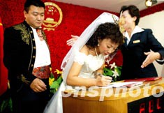 新《婚姻登記條例》十月一日正式實施,結婚不再需要單位證明,只需持本人戶口本和身份證,并共同簽署一份簽字聲明。中新社記者:鄭萍萍