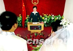 十月一日一早短短兩個小時,北京市東城區婚姻登記處服務人員為近五十對新人舉行簡短的頒證儀式。新婚姻登記條例于當日正式實施,從此所有新人都將享受頒證儀式。中新社記者:鄭萍萍