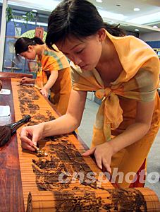第六屆北京國際藝術博覽會“十一”黃金周在北京舉行,展出的一萬多件中外藝術家作品,為北京觀眾節日文化生活增添了一道亮麗的藝術風景線。圖中展示的是全長3.7米的竹簡雕刻極品《清明上河圖》。中新社記者:張勤