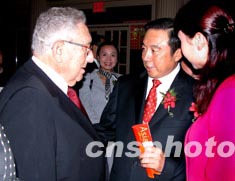 美東時間十月九日晚,美國前國務卿基辛格(左)來到紐約華爾道夫酒店,祝賀中國最大的上市銀行——招商銀行在美國設立代表處。中新社記者:陳建