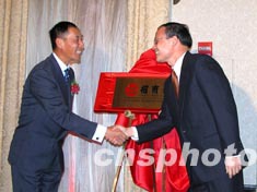 圖為揭牌儀式上,中國駐紐約總領事劉碧偉(右)向招商銀行董事長秦曉(左)表示祝賀。