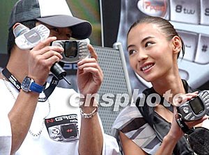 香港明星陳小春、張柏芝,周日一同亮相時代廣場,為諾基亞首部手提游戲手機作推廣活動,張柏芝站在陳小春身后不停笑他十分投入的姿態。中新社記者:錢興強