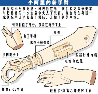 中新網10月13日電 據路透社報道,英國一家報紙星期一報道說,在伊拉克戰爭中失去雙臂和大部分家人的伊拉克男童已成功地安裝上了人造假肢。