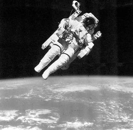 1984年6月7日,美國航天飛機“挑戰者”號宇航員布魯斯·麥坎德利斯使用載人機動裝置,離開航天飛機320英尺,完成了人類首次無安全索太空行走。新華社圖