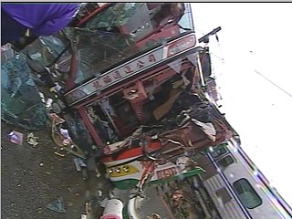 中新網(wǎng)10月14日電 臺北縣鶯歌鎮(zhèn)今日上午7點38分,發(fā)生重大車禍,在東鶯路平交道,游覽車疑似闖平交道,當場被南下電聯(lián)車撞上,造成4死27人受傷。