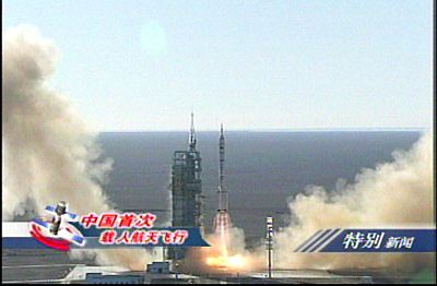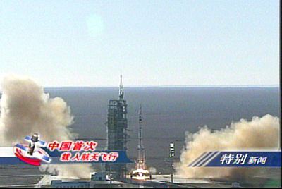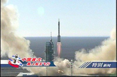 北京時間十五日上午九時整,“神舟”五號載人飛船由“神箭”——“長征二號F”運載火箭從酒泉衛星發射中心載人航天發射場發射升空,“神箭”升空十多分鐘后,中國載人航天工程指揮部總指揮宣布,“神舟”五號載人飛船已成功進入預定軌道,發射取得成功。