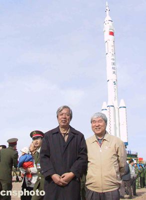 “神舟”五號載人飛船總設計師戚發軔(右)和“神箭”——長征二號F運載火箭總設計師劉竹生在箭船塔組合體垂直轉運現場合影留念。中新社記者孫自法攝