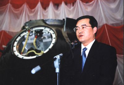 張慶偉在“神舟”四號飛船返回艙前。(中國航天科技集團供圖)