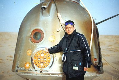 “神舟”五號(hào)飛船系統(tǒng)總指揮袁家軍與返回艙
