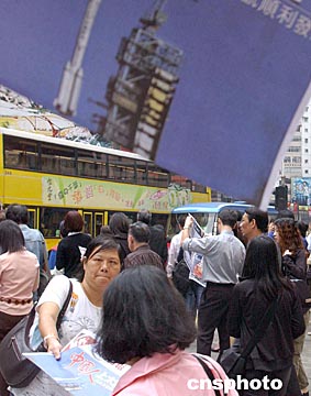 中國“神舟”五號十月十五日上午九時在酒泉衛(wèi)星發(fā)射中心成功升空,香港市民關(guān)注“神舟”五號首次載人發(fā)射成功。中新社記者:錢興強(qiáng)